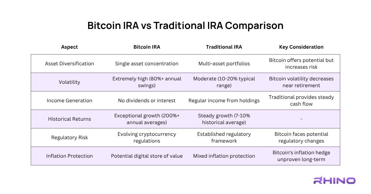 Diversification strategies can combine both approaches by maintaining traditional IRAs alongside Bitcoin IRAs or by allocating only a portion of retirement savings to Bitcoin. This balanced approach captures potential Bitcoin upside while maintaining the stability and income generation of traditional retirement investments.