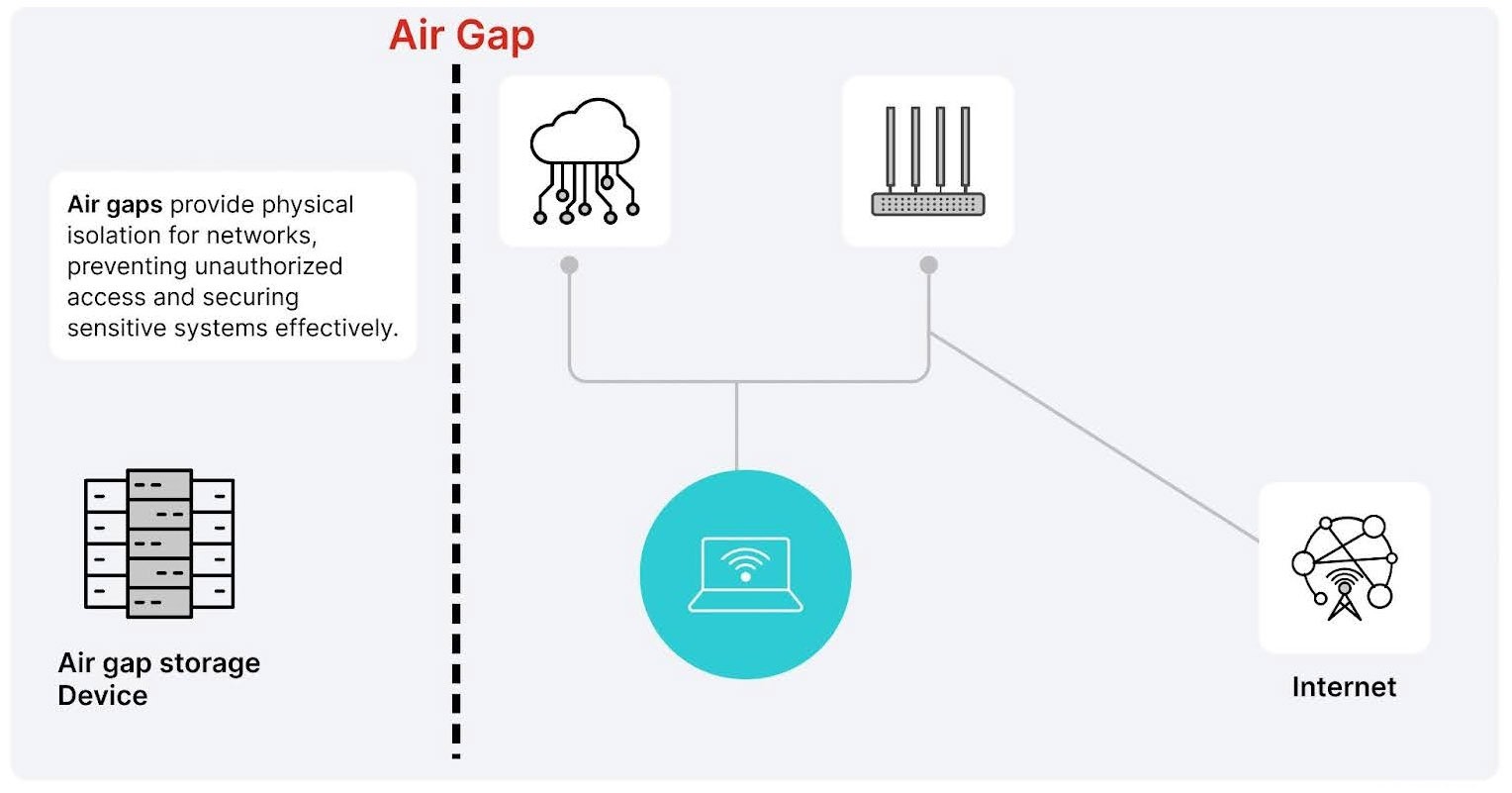 Air Gap (Definition): A security measure that isolates a computer or device from unsecured networks, including the internet. Air-gapped systems can only be accessed through physical presence, eliminating remote attack vectors.