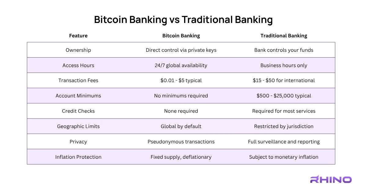 Bitcoin banking offers fundamental advantages over traditional banking by eliminating intermediaries, reducing costs, and providing global accessibility. While traditional banks control your money and impose restrictions, Bitcoin gives you direct ownership and unrestricted access to your wealth.